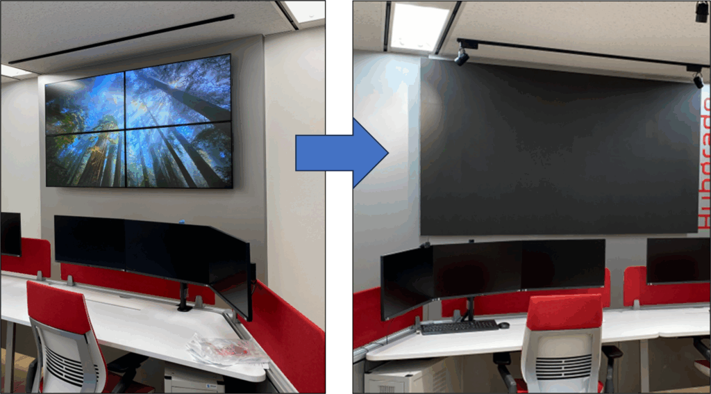 新しい発想で監視ルームを構築したい、というご相談。来訪するお客様へのプレゼンテーションビデオを流したり、WEB会議もできて、かつオペレーションはシンプルに、というご要望。