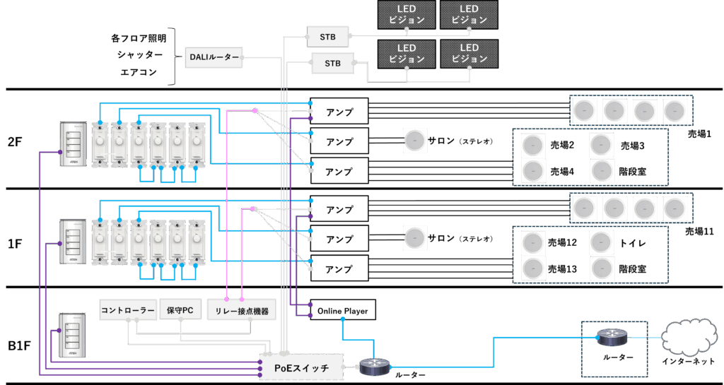 ブティックスタッフのオペレーション簡素化のためにできる限りシンプルな方法を考案してご提案。開店、閉店に合わせた照明、BGM、映像のON/OFF、個別調整したい機器のボタン化などを実施することで、わかりやすい統合システムをご提案し採用いただく。